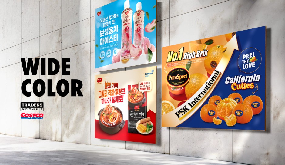 동원 F&B와 PSK International의 코스트코/이마트 트레이더스 전시용 와이드칼라를 제작하였습니다.